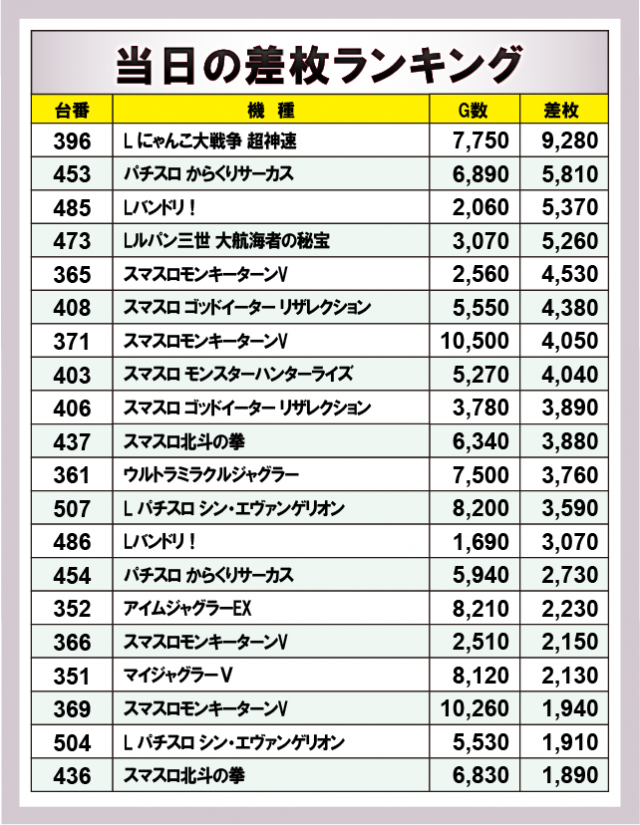 ※差枚数順に掲載しています。