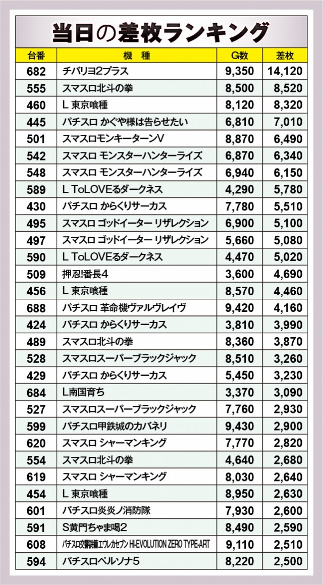 『チバリヨ2プラス』にて万枚OVERを確認でき、同機種が店内の盛り上がりをリードする存在となっていた。そして『L 東京喰種』『スマスロ北斗の拳』でも8,000枚OVER、『パチスロ かぐや様は告らせたい』にて7,000枚OVERと気を吐き、大台突破台が数多く生まれている点も目に焼きつくポイントだ。いずれの機種も7~8,000回転と終日を通して打ち込まれており、ファンが相当な手応えを感じていたのは間違いない。
