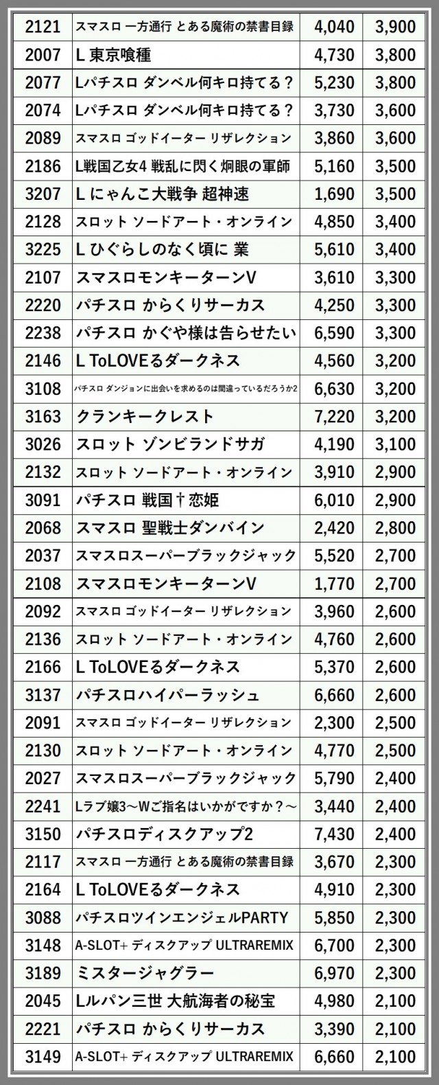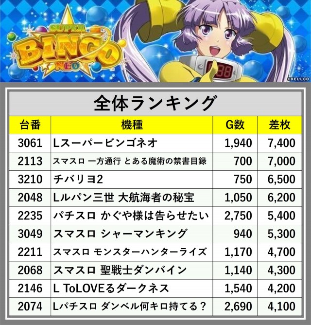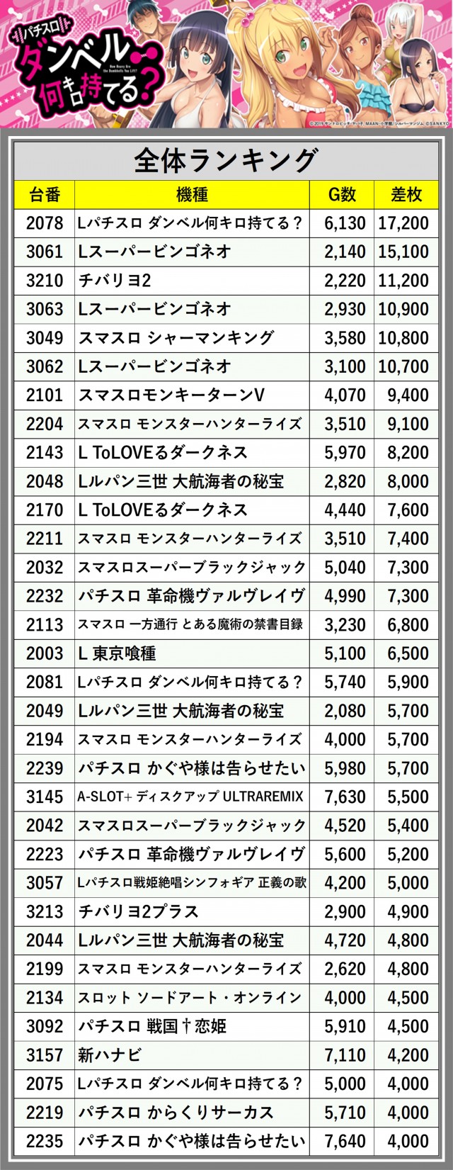 厳選された取材対象機種をはじめ、その他スロット全体から好記録が飛び出した!プレイヤーが楽しんだ1日を下記データにて振り返ってみて欲しい。