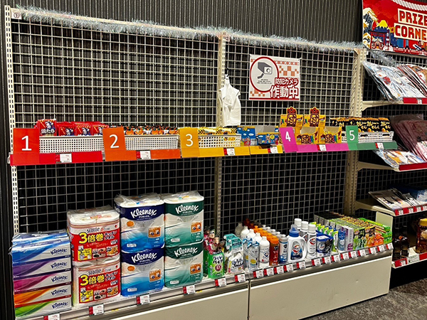 景品コーナーには日用品・お菓子・キャラクターグッズなど多彩なアイテムが揃っており、プレイヤーたちの目を引いていた。