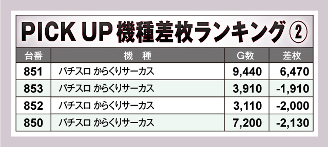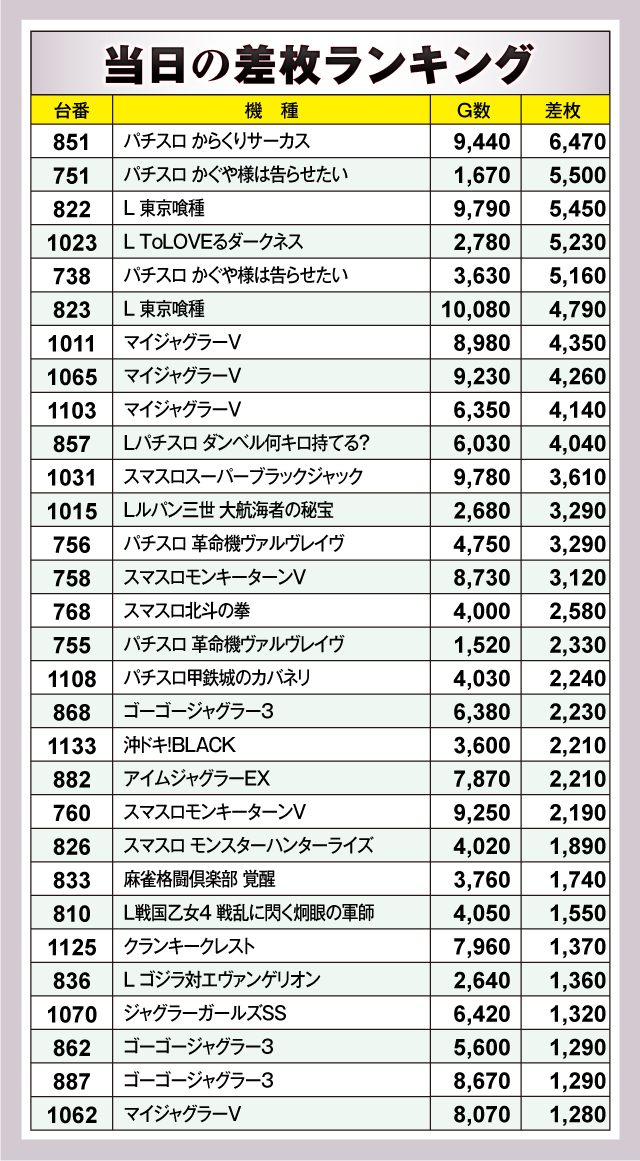 まずは差枚ランキングのチェックから。30台のうち21台が差枚+2,000枚オーバーで、+3,000枚オーバーは14台出現。それらのなかでもっとも優秀だったのは、851番台の「パチスロ からくりサーカス」で、差枚は+6,470枚を獲得! その他ランクイン機種をチェックしてみると、ハイスペックスマスロ機種やジャグラーシリーズまで幅広い機種がランクイン。訪れたファンたちが存分に楽しめる環境が用意されていたようだ!