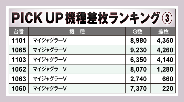 続いては、当日とくに盛り上がっていた3機種を紹介。3機種のピックアップ台すべてから好記録が出現しており、とくに「マイジャグラーV」は、ピックアップ6台のうち4台が差枚+1,000枚以上の大幅プラスをマーク! これらの機種たちの盛り上がりを見れば、当日どれほどの賑わいを見せていたのかが分かってもらえたハズだ!