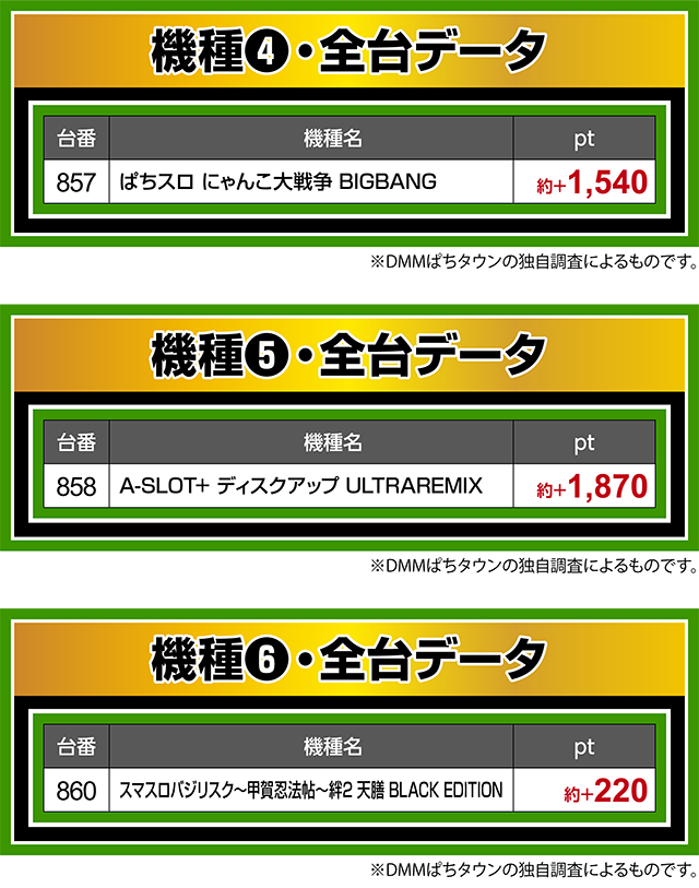『ぱちスロ にゃんこ大戦争 BIGBANG』の857番台と『A-SLOT+ ディスクアップ ULTRAREMIX』の858番台が約+1,500ptを超え、『スマスロバジリスク~甲賀忍法帖~絆2 天膳 BLACK EDITION』の860番台もプラスとなった。