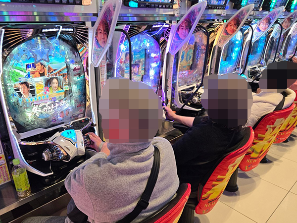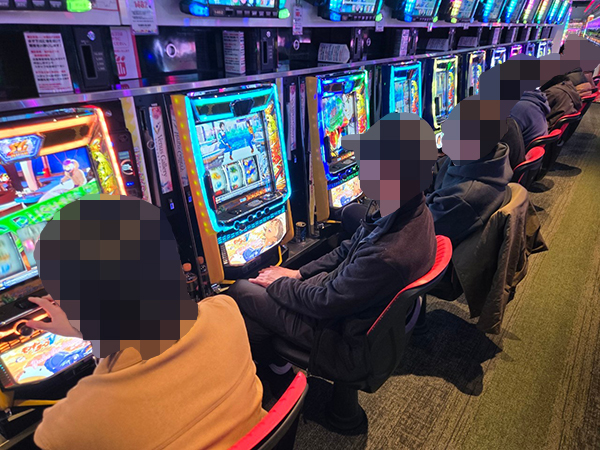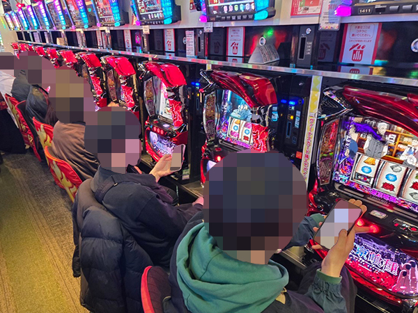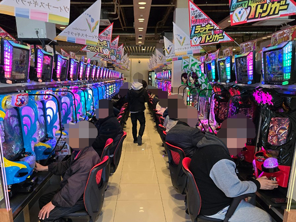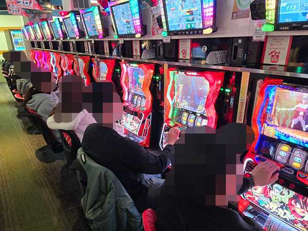 取材時は多くのプレイヤーが来店。パチンコ・パチスロともに、様々な機種が支持を得ていた。