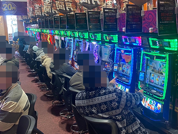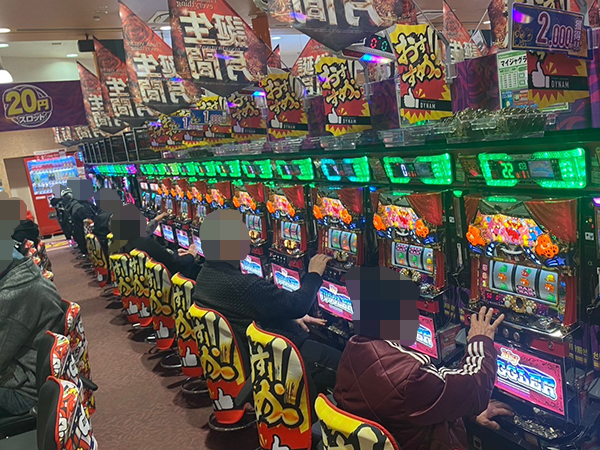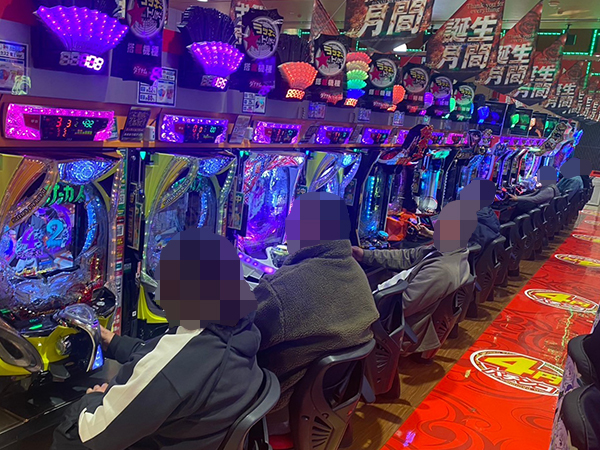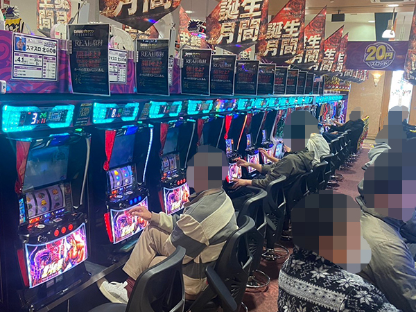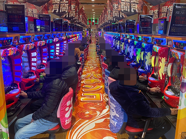 取材時は既に多くのプレイヤーが集結し、パチンコ・パチスロを問わずにぎやかな状況となっていた。