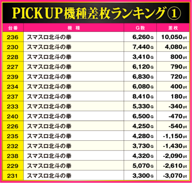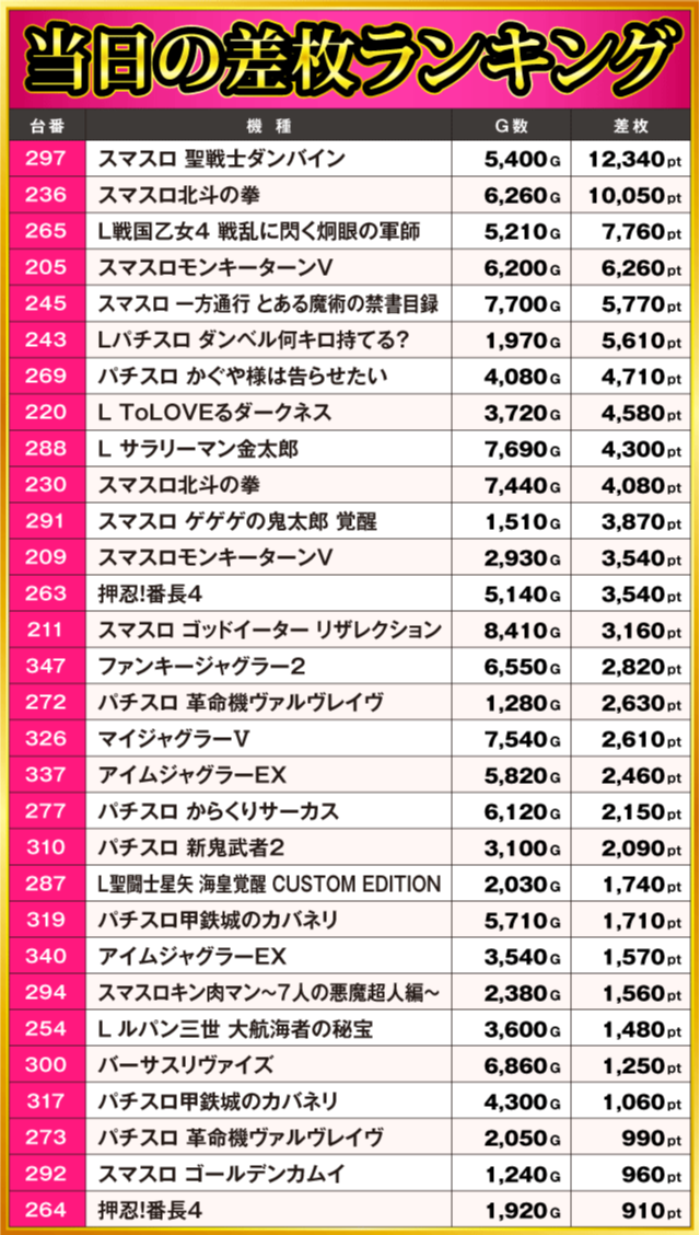この日、最も勢いを見せていたのが『スマスロ 聖戦士ダンバイン』で、297番台が+12,340ptを叩き出しランキングトップに。また、続く『スマスロ北斗の拳』も+10,050ptを記録しており、ランキング上位が実にハイレベルな結果を残す一日となった。