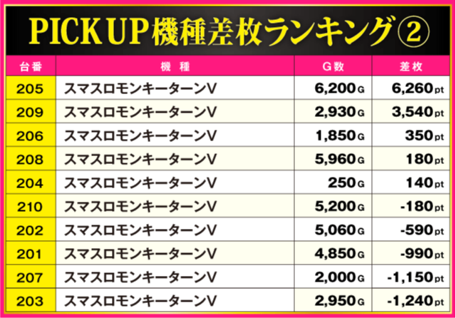 次にPICK UP機種の状況を見てみると、万枚超が発生した『スマスロ北斗の拳』は他にも+4,080pt、『スマスロモンキーターンV』は+6,260ptと好成績が続出。さらに、両機種とも約半数の台がプラス差枚で終了しているだけに、シマ内は常に活気に満ち溢れていた。
