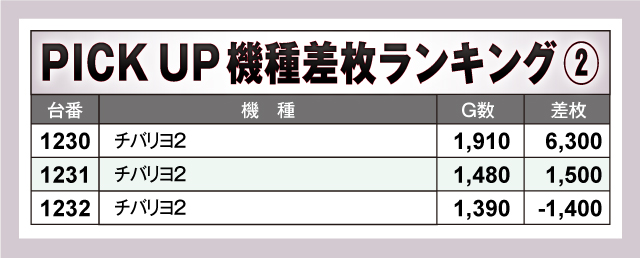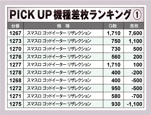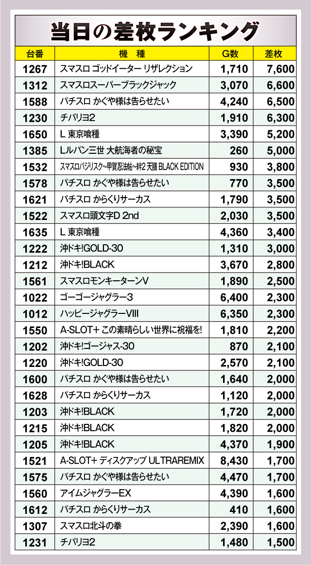 まずは差枚ランキングのチェックから。30台のうち23台が差枚+2,000枚オーバーで、+3,000枚オーバーは12台出現。それらのなかでもっとも優秀だったのが1267番台の「スマスロ ゴッドイーター リザレクション」で、差枚は+7,600枚をマーク! また、その他機種としては「沖ドキ!BLACK」「パチスロ かぐや様は告らせたい」などが複数ランクイン。様々な機種から好記録が出現していたので、チャンスは至るところにあったようだ!