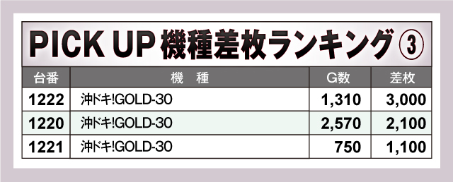 続いては、当日店内を盛り上げた3機種を紹介していこう。どの機種からも好調台が出現していたが、とくに注目なのは「沖ドキ!GOLD-30」だろう。ピックアップ3台すべてがプラス終了しており、さらにその3台すべてが差枚+1,000枚オーバーと素晴らしい結果を残していた! もちろんその他2機種も注目すべき台がいくつも確認できたので、これら3機種が当日の盛り上がりを牽引していたのは間違いなさそうだ!