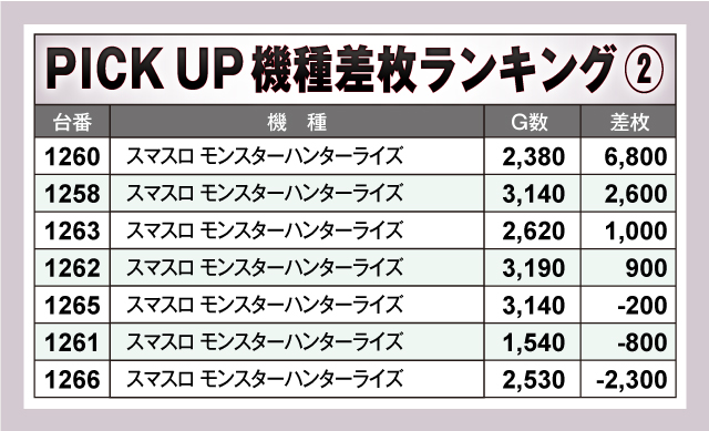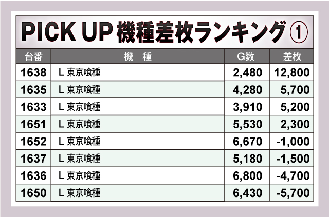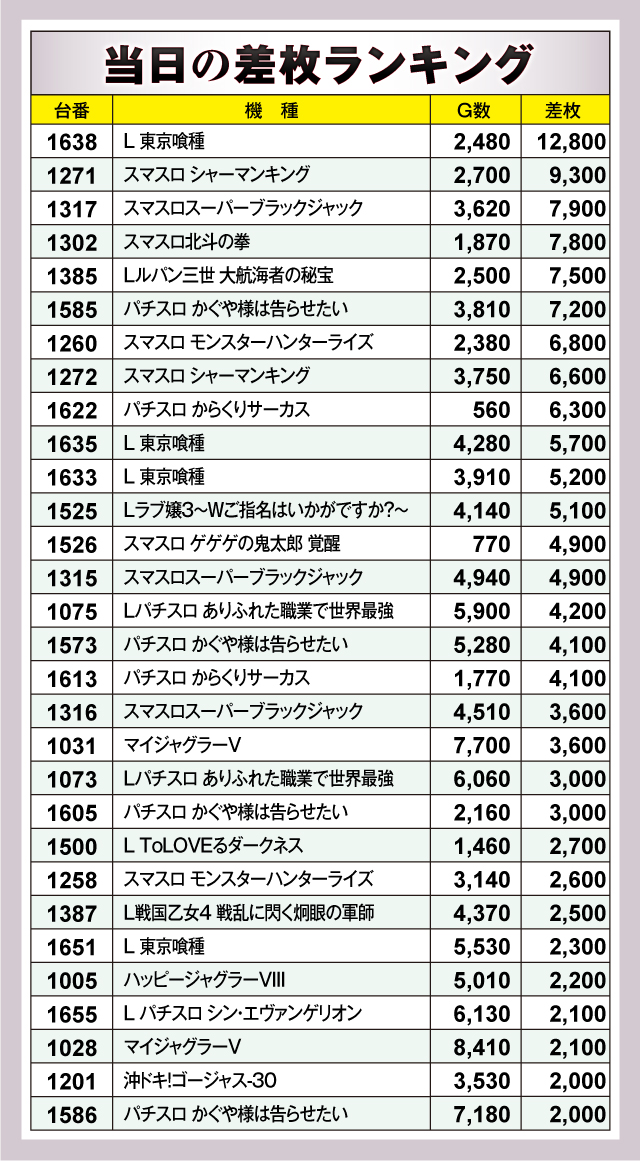 まずは差枚ランキングのチェックから。30台すべてが差枚+2,000枚オーバーで、+3,000枚オーバーは21台、+5,000枚オーバーは12台出現。それらのなかでもっとも優秀だった台は、1638番台の「L 東京喰種」で、差枚は+12,800枚の特大記録をマーク! その他ランクイン機種には、「スマスロ シャーマンキング」や「スマスロスーパーブラックジャック」などの最新台を筆頭に、「マイジャグラーV」「パチスロ かぐや様は告らせたい」などといった人気機種もランクイン。多種多様な機種にチャンスがあったようだ!