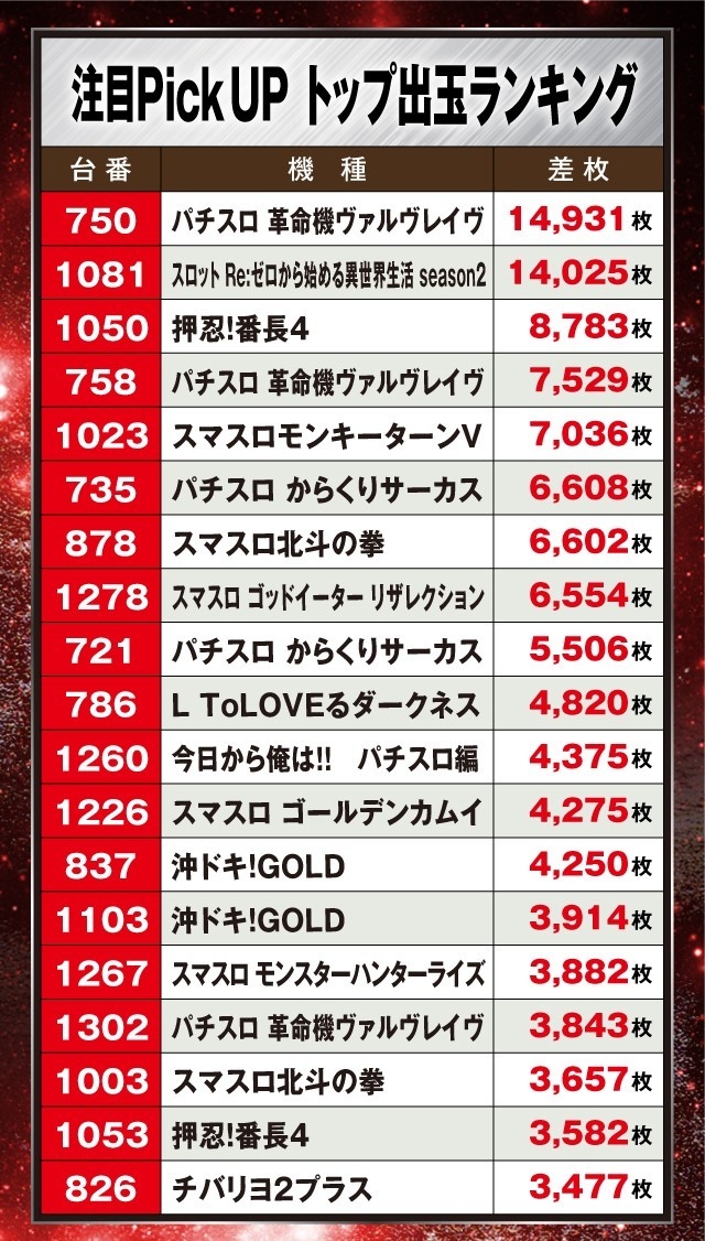 また、その他の機種からも好成績が大量発生。『押忍!番長4』の+8,783枚、に『スマスロモンキーターンV』の+7,036枚、さらには『パチスロ からくりサーカス』、『スマスロ北斗の拳』、『スマスロ ゴッドイーター リザレクション』で+6,000枚超など、あらゆる機種が盛り上がりを見せていた。