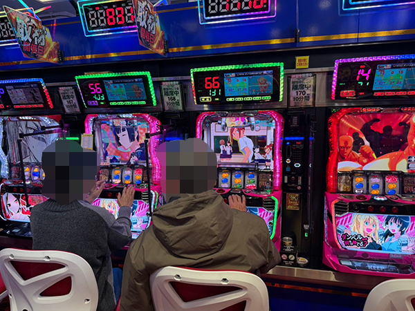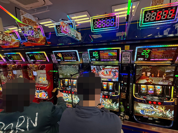 取材時は多くのプレイヤーが来店。パチンコ・パチスロともに、様々な機種が支持を得ていた。