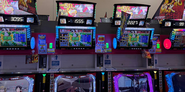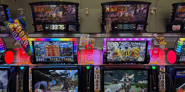 前回開催同様”ドキドキした日を取り戻す!これぞ地元愛「破天荒店長」”というスローガンを掲げ迎えた取材当日。248番台『スマスロ モンスターハンターライズ』の+14,400ptをはじめ、『スマスロ ゴッドイーター リザレクション』526番台+12,520pt、530番台+11,670ptなど、複数の機種が1万ptオーバーを達成していた。