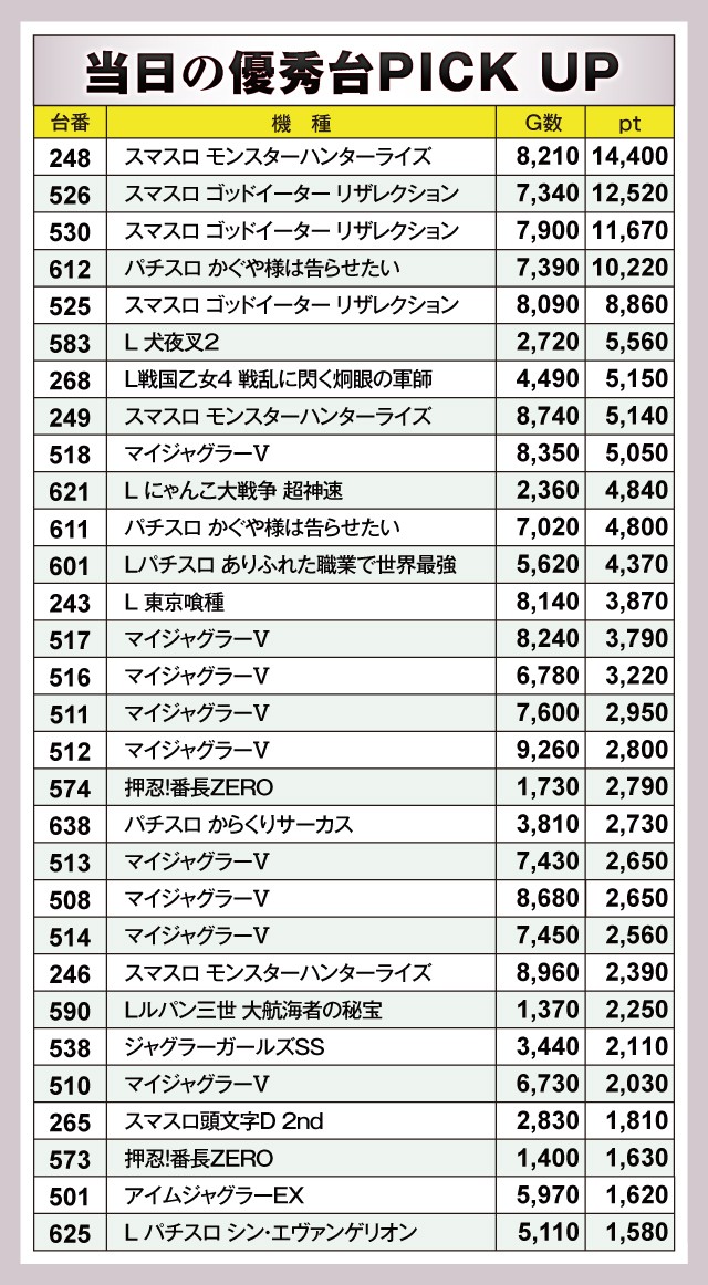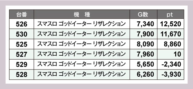 『スマスロ ゴッドイーター リザレクション』は526番台+12,520pt、530番台+11,670pt、525番台+8,860ptと活況で、多くのプレイヤーが機種性能を最大限に引き出せていた。