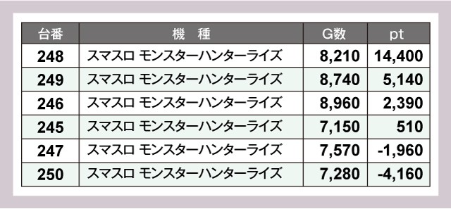 『スマスロ モンスターハンターライズ』も圧巻のパフォーマンスを披露。248番台は+14,400pt、249番台は+5,140ptと大満足の結果になっている。