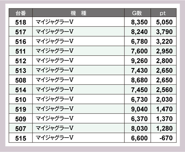 さらに『マイジャグラーⅤ』は4桁ptが続出しており、中には+5,000ptを超える好調台が誕生していた。