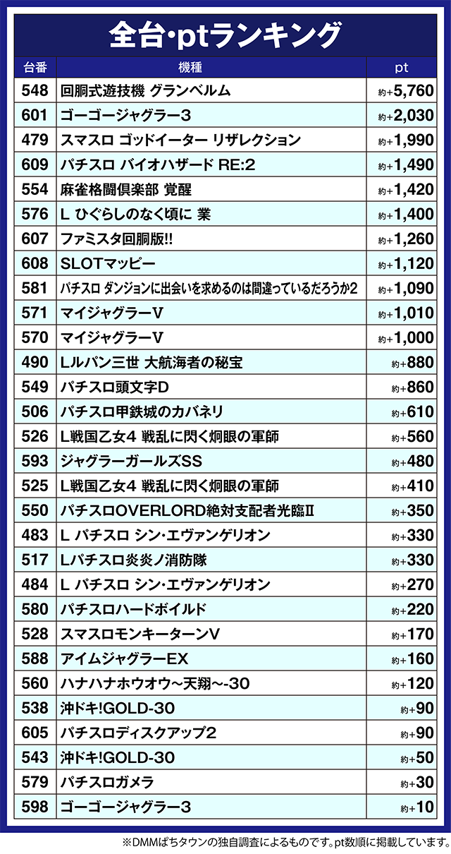 ほかにも、「パチスロ バイオハザード RE:2」の609番台や「麻雀格闘倶楽部 覚醒」の554番台などが約+1,400pt以上となった。