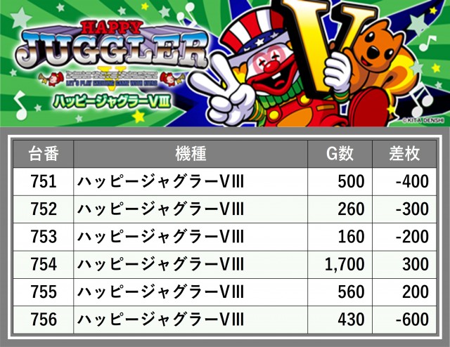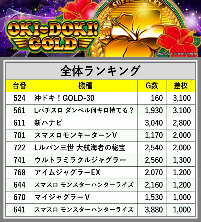 厳選された取材対象機種をはじめ、その他スロット全体から好記録が飛び出した!プレイヤーが楽しんだ1日を下記データにて振り返ってみて欲しい。