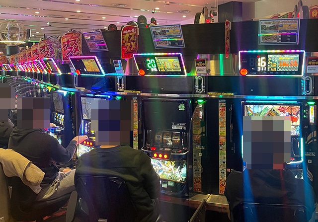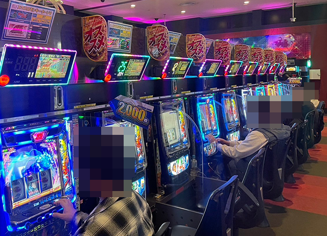 「アイムジャグラーEX」や「マイジャグラーⅤ」に楽しげなプレイヤーがおり、活気は大きい。