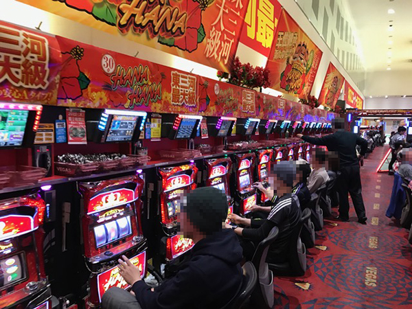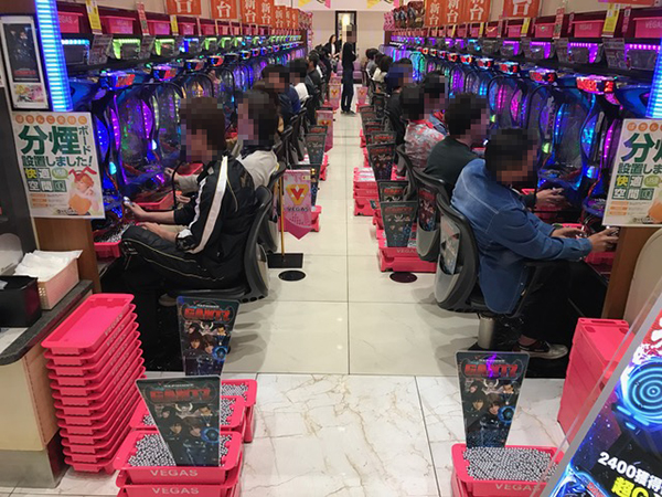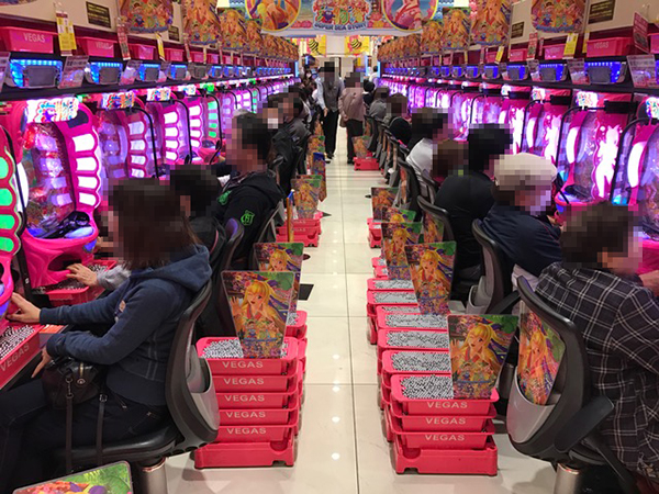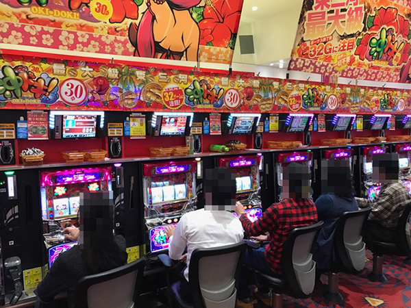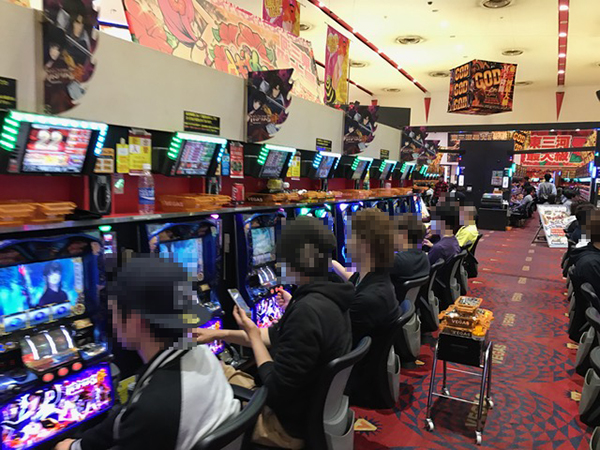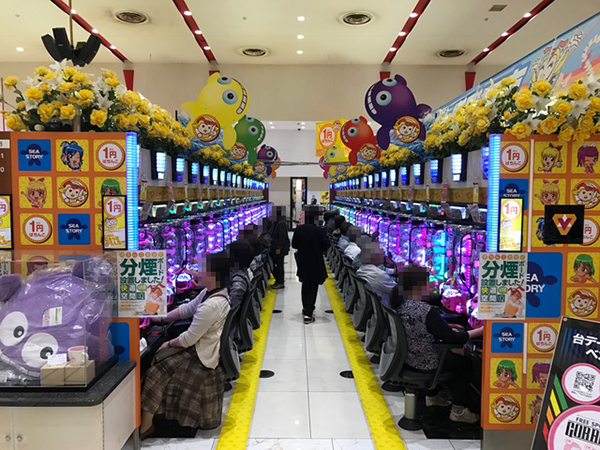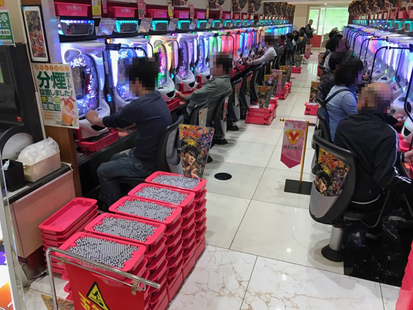 午後の4円パチンコはコーナー全体に熱気が帯びており、大盛況な様子。