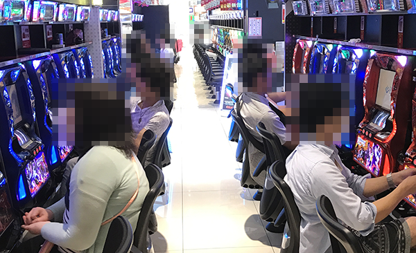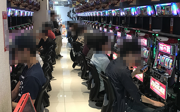 16時頃の20円パチスロをみると、「バジリスク~甲賀忍法帖~絆」や「押忍!番長3」などが盛況。華やかなシーンがあちこちにみられるなど、各シマを明るい雰囲気がつつんでいた。
