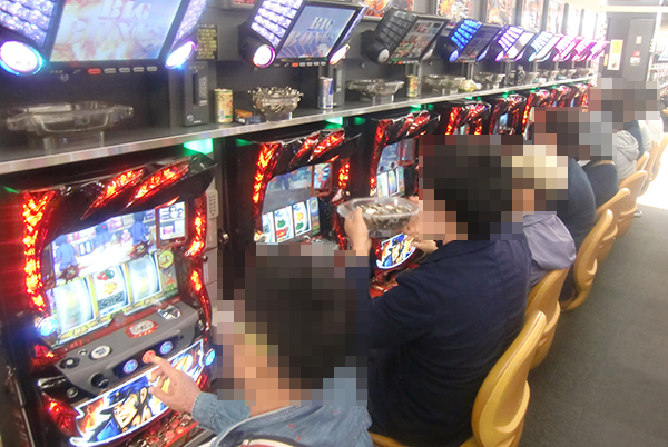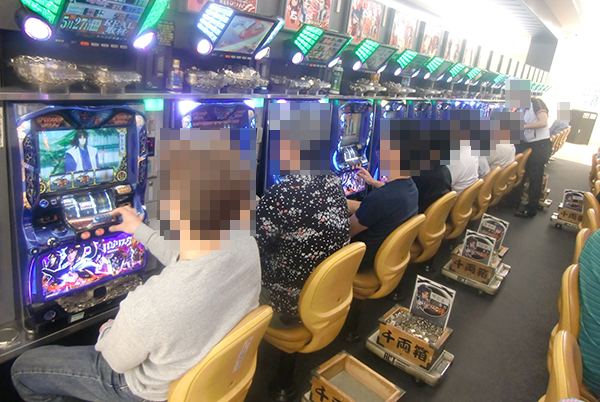 パチスロの様子をうかがうと、「バジリスク~甲賀忍法帖~絆」に機種の性能を引き出しているようなプレイヤーを目撃。シマ内に広がる光景は明るく、強く印象に残るほどであった。