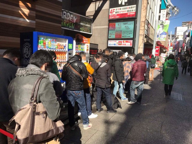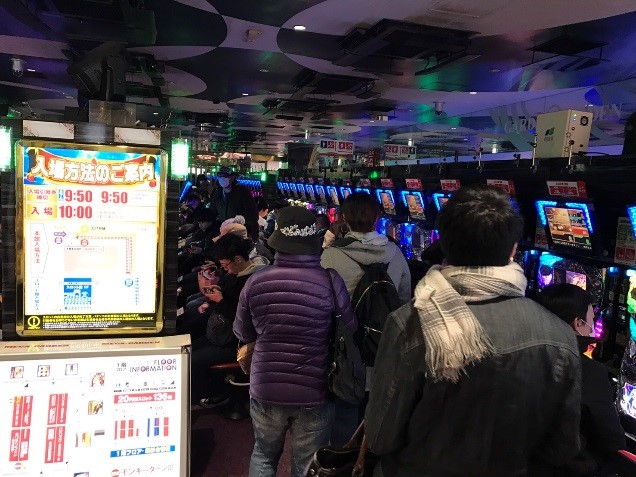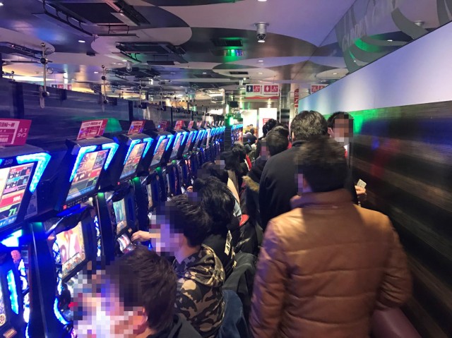 最初はパチスロ待機列に並んでいたファンたちが入場していく。
