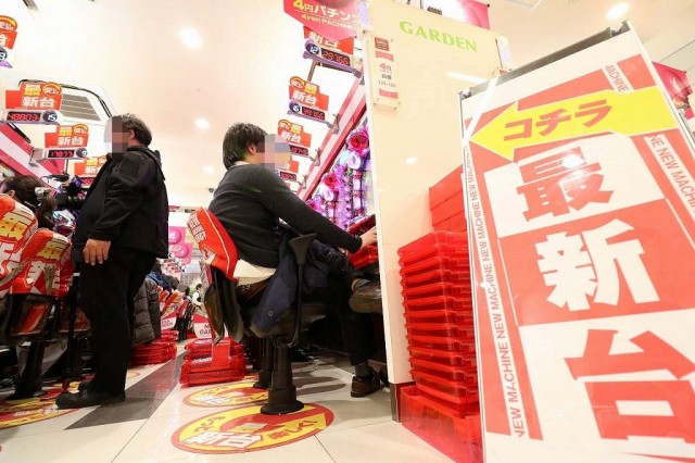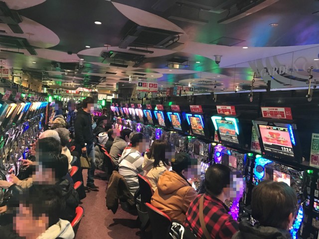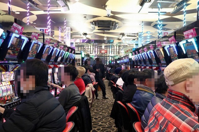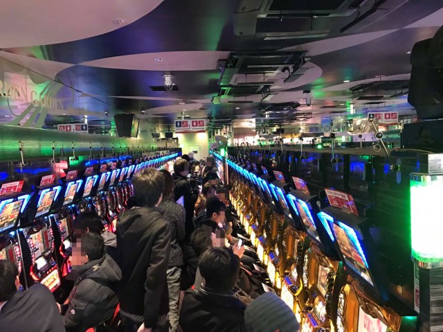 | 【パチスロ】朝一から満台となったフロア。『GOD』シリーズはもちろんのこと。『バジリスク』シリーズや『北斗』シリーズなどお馴染みの機種は勿論満台。 空き台を求めてさまよう人が多数! |