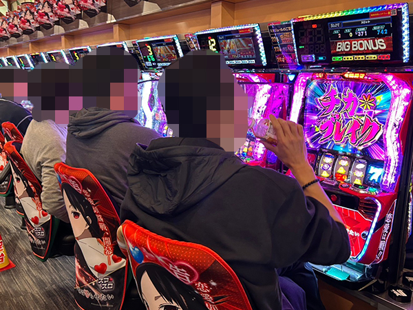 1000円/46枚パチスロに目を向けると、「L 東京喰種」や「パチスロ かぐや様は告らせたい」で華麗なパフォーマンスを披露するプレイヤーが複数見られ、シマ内からは活気が感じられた。