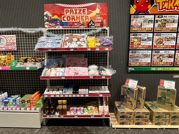 景品コーナーには日用品・キャラクターグッズ・お酒類など多彩なアイテムが揃っており、プレイヤーたちの目を引いていた。