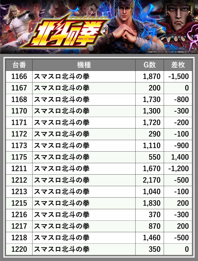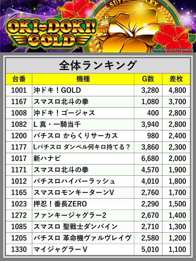 厳選された取材対象機種をはじめ、その他スロット全体から好記録が飛び出した!プレイヤーが楽しんだ1日を下記データにて振り返ってみて欲しい。