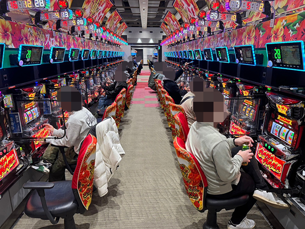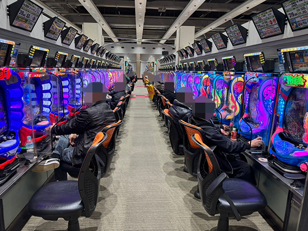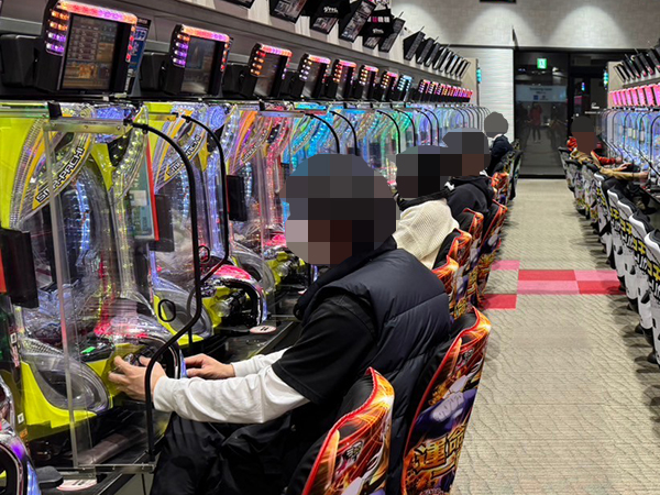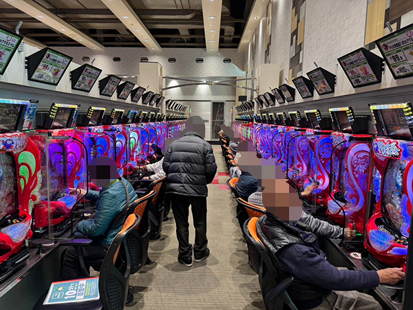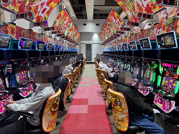 取材時は多くのプレイヤーが来店。パチンコ・パチスロともに、様々な機種が支持を得ていた。