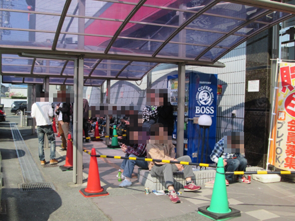 朝イチは開店の30分ほど前からプレイヤーの列が伸び始め、開店直前には約60名がホール前に集まっていた。
