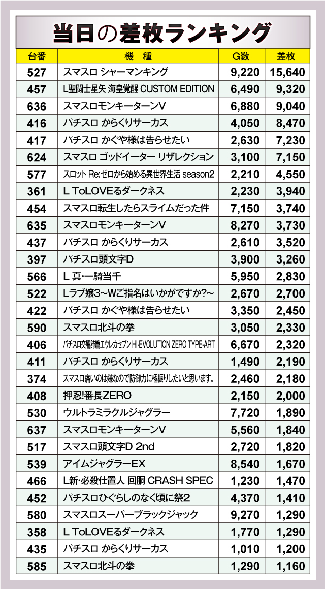 つづいて『パチスロ からくりサーカス』416番台が+8,470枚。『パチスロ かぐや様は告らせたい』417番台が+7,230枚。『スマスロ ゴッドイーター リザレクション』624番台が+7,150枚と大満足の差枚に。少し離れて『スロット Re:ゼロから始める異世界生活 season2』577番台が+4,550枚など、ズラリと優秀台が並ぶ豪華なランキングとなっている。