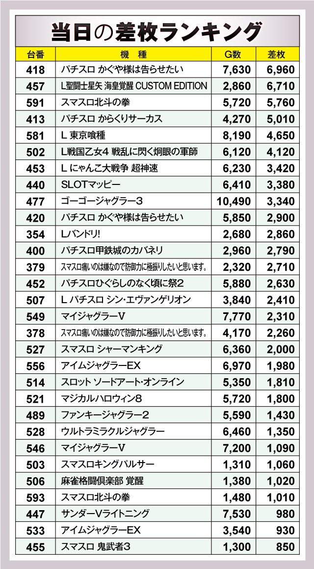 ※差枚数順に掲載しています。
