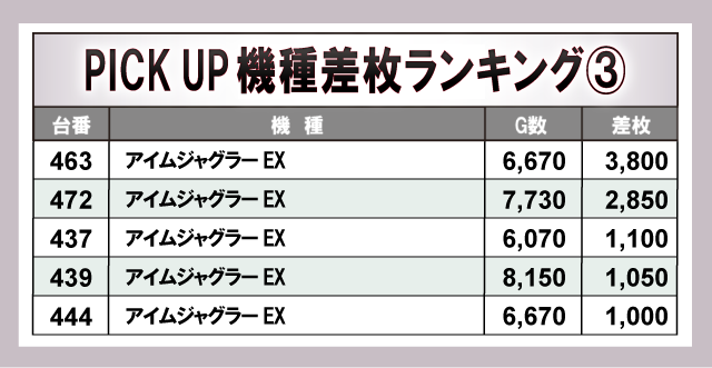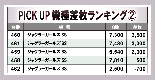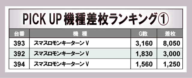 さらに、当日盛り上がりを見せていた5機種に注目してみると、多くの機種で4桁プラス差枚台の割合が高くなっていた。人気スマスロ機だけではなく『ジャグラー』シリーズからも好調ぶりが窺えた内容で、高いポテンシャルを秘めた台が数多く存在していた。