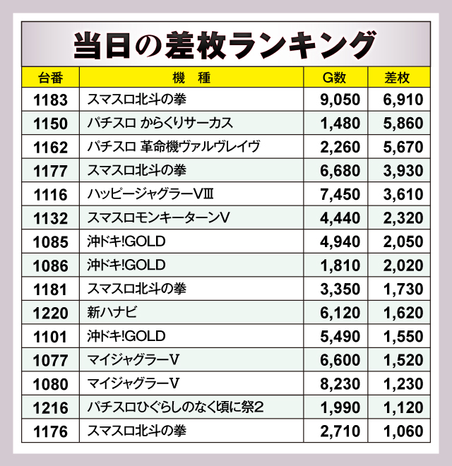※差枚数順に掲載しています。