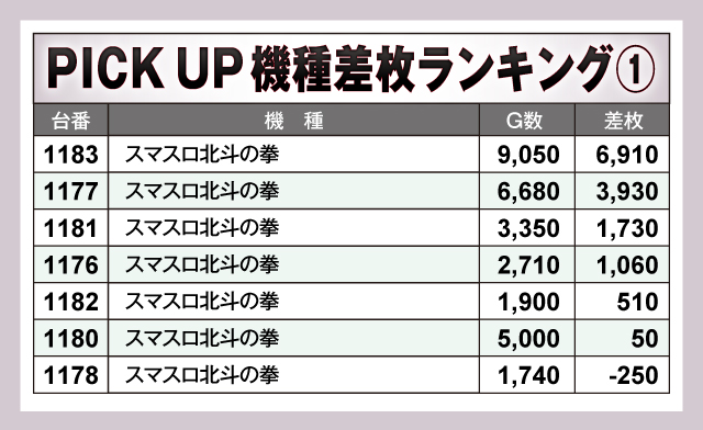 ピックアップ機種では、『スマスロ北斗の拳』が絶好調。優秀台でも紹介した1183番台の+6,910枚、1177番台の+3,930枚の2台を筆頭に、7台中6台がプラスという安定感を見せた。特に1183番台は9,000Gを越えるG数を記録しており、稼働においても大きく貢献している。