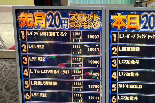 優秀台を見てみると、+6,910枚を記録した『スマスロ北斗の拳』の1183番台がトップに立った。さすがはスマスロの代表的存在だけのことはる。また、同機種は1777番台が+3,930枚、1181番台が+1,730枚をマークしている。これに続いたのが+5,860枚の『パチスロ からくりサーカス』1150番台。現在の人気では『北斗の拳』をも凌ぐほどで、その人気にしっかり応えている。3位となったのは、1162番台が+5,670枚を記録した『パチスロ 革命機ヴァルヴレイヴ』。スマスロの第1号機として歴史に名を刻む一台だが、人気、実力ともにまだまだ後継機たちに負けてられないところだ。以下、+3,610枚の『ハッピージャグラーⅧ』1116番台、+2,320枚の『スマスロモンキーターンV』1132番台、+2,050枚の『沖ドキ!GOLD』1085番台、+2,020枚の同1086番台、+1,620枚の『新ハナビ』1220番台と続いた。