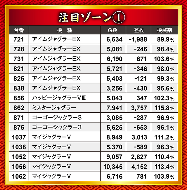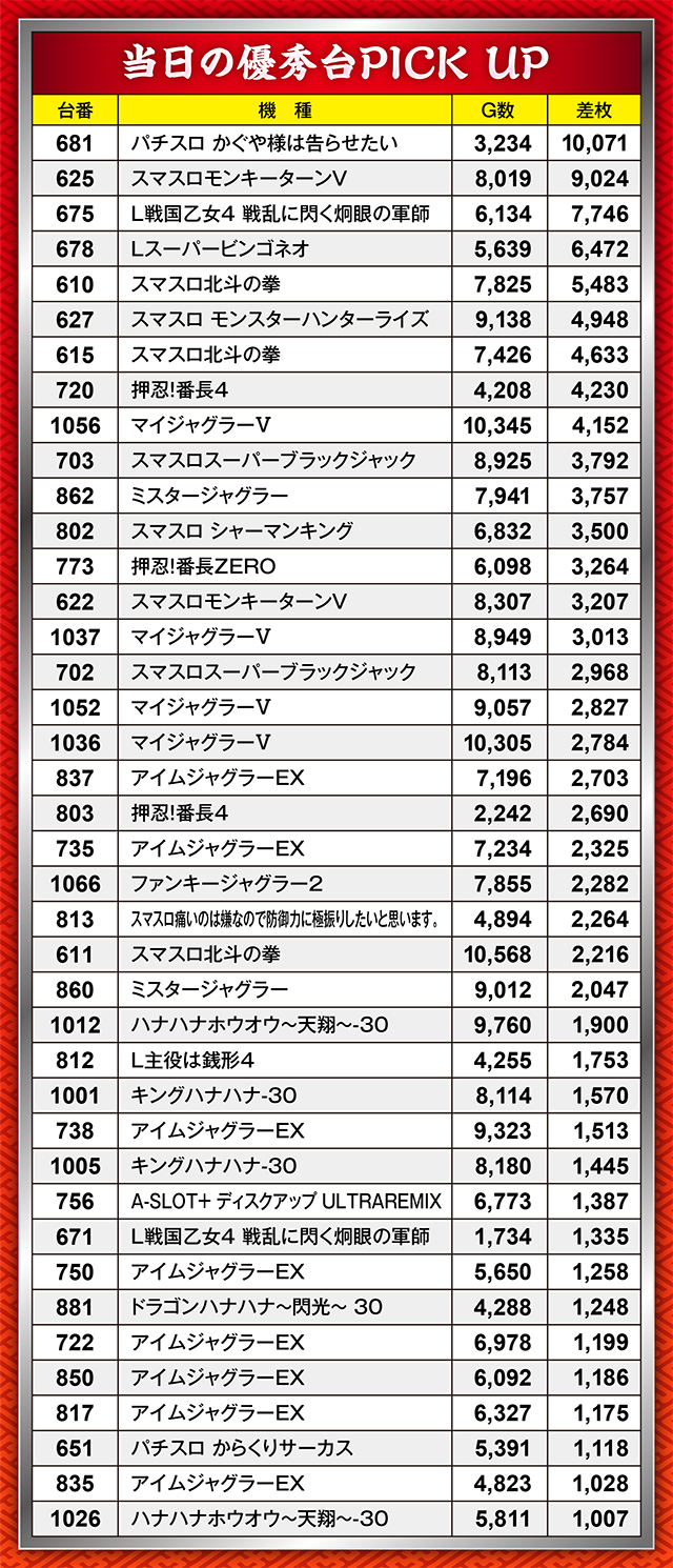 2月に入ってもその勢いを衰えさせず、今回も多くのプラス台を生み出してくれた。人気マシンから多くのプラス台が生まれていたのはもちろんのこと、この日は特に『ジャグラー』シリーズの躍動も目立っていた様子。また直近の新台たちもかなり奮闘していたようだ。