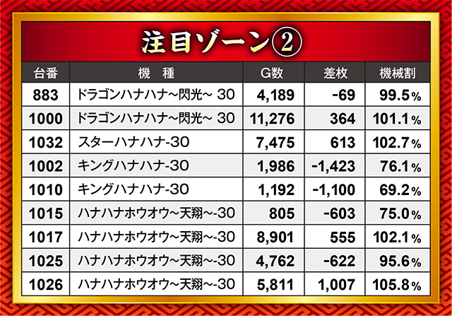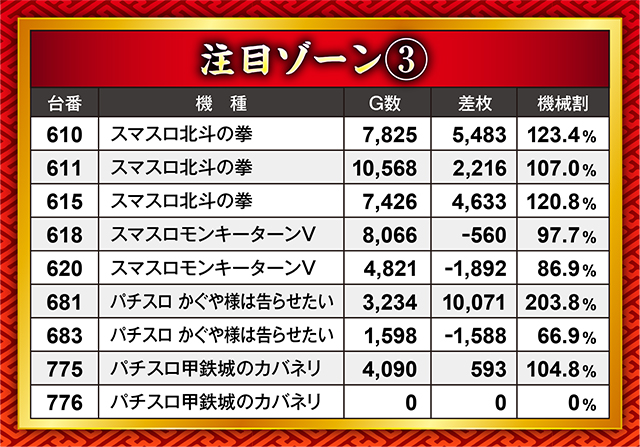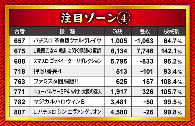 こちらのゾーンでの注目は、7,500枚オーバーを果たした『L戦国乙女4 戦乱に閃く炯眼の軍師』の大活躍だろう。その機械割はなんと140%オーバー!誰の目にも優秀台として映っていたのは間違いなさそうだ。