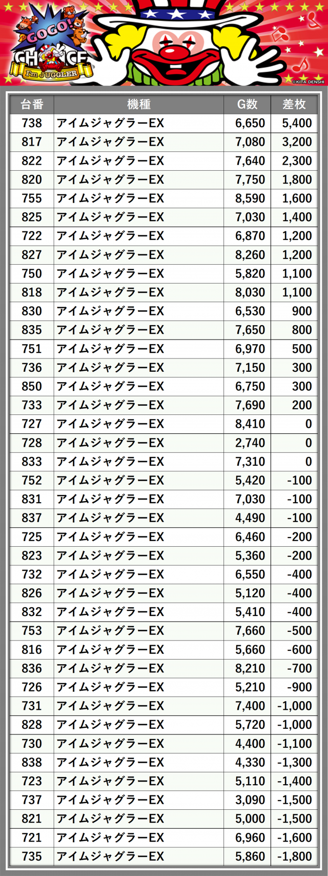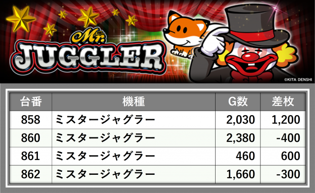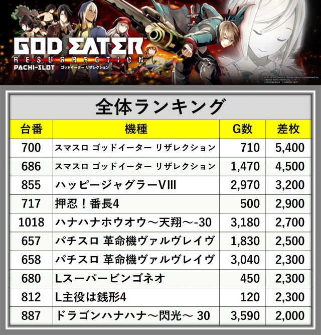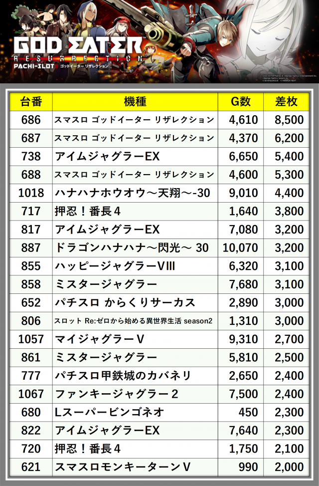厳選された取材対象機種をはじめ、その他スロット全体から好記録が飛び出した!プレイヤーが楽しんだ1日を下記データにて振り返ってみて欲しい。