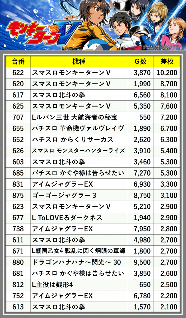 厳選された取材対象機種をはじめ、その他スロット全体から好記録が飛び出した!プレイヤーが楽しんだ1日を下記データにて振り返ってみて欲しい。
