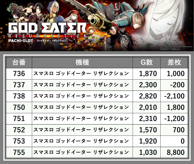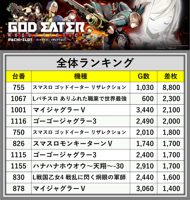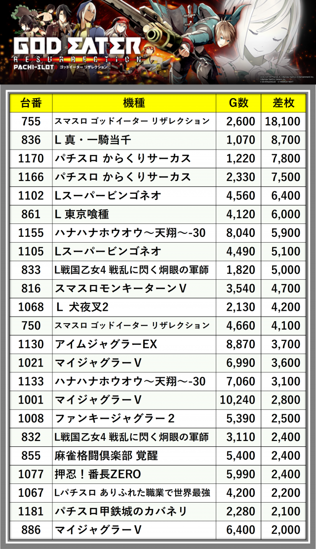 厳選された取材対象機種をはじめ、その他スロット全体から好記録が飛び出した!プレイヤーが楽しんだ1日を下記データにて振り返ってみて欲しい。