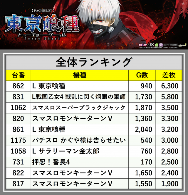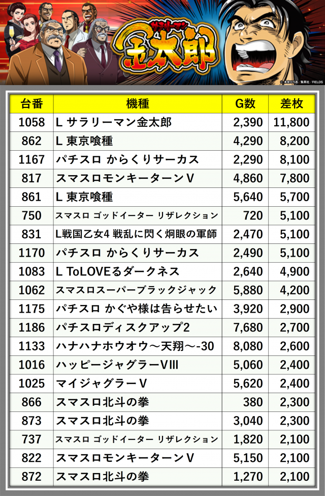 厳選された取材対象機種をはじめ、その他スロット全体から好記録が飛び出した!プレイヤーが楽しんだ1日を下記データにて振り返ってみて欲しい。