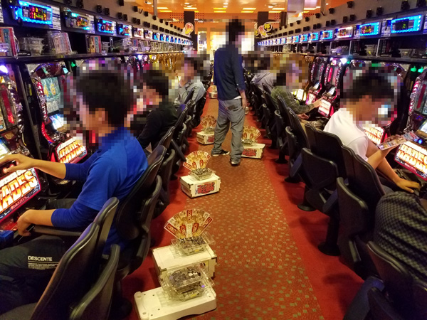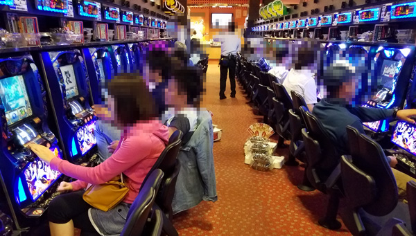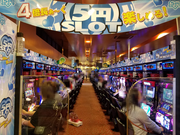 5円パチスロコーナーも盛況。ボーナスタイプからART機にいたるまで、様々な機種が設置されており、たくさんのプレイヤーでシマは活気に満ちていた。