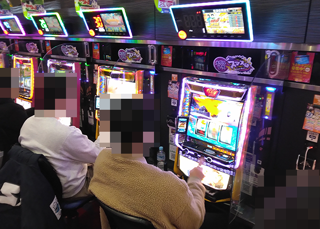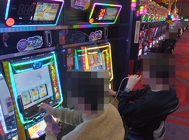 パチスロをみると、「キングハナハナ-30」に楽しげなプレイヤーが並んでいた。