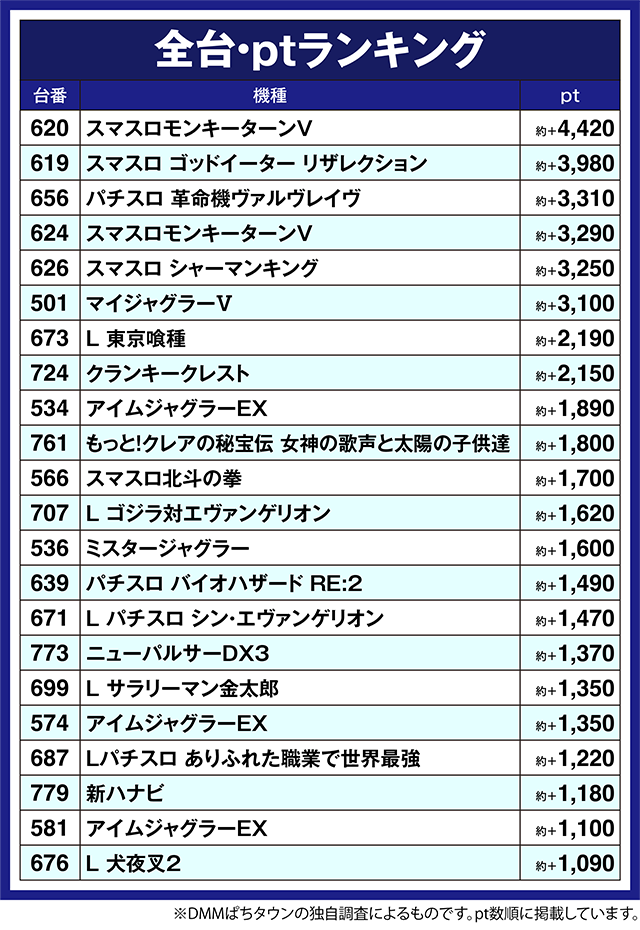 最新機種でも、「スマスロ シャーマンキング」の626番台や「L 東京喰種」の673番台が約+2,100pt以上となった。