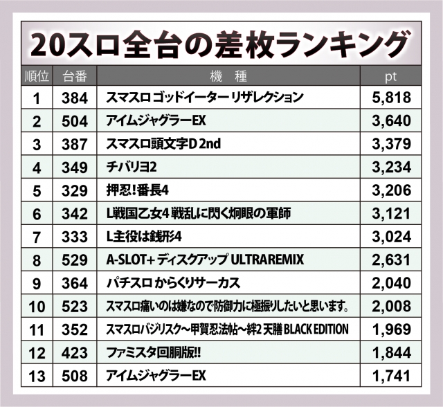 成績順に並べていくと、 『スマスロ ゴッドイーター リザレクション』の+5,800枚超、『アイムジャグラーEX』の+3,600枚超、『スマスロ頭文字D 2nd』の+3,400枚弱、『チバリヨ2』『押忍!番長4』が共に+3,200枚超、『L戦国乙女4 戦乱に閃く炯眼の軍師』の+3,100枚超、『L主役は銭形4』では+3,000枚超と、スマスロ多数の中にボーナスタイプが紛れる結果となった。