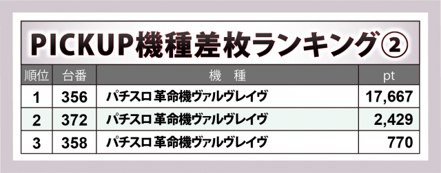語る上で外せないのが『パチスロ 革命機ヴァルヴレイヴ』。356番台が+17,700枚弱に達した上に+2,400枚超が1台と、同店の看板らしい存在感を放っていた。